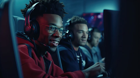 A young African American guy, enjoying spending time with his friends, playing in a multiplayer video game on a PC in a gaming club or internet cafe.