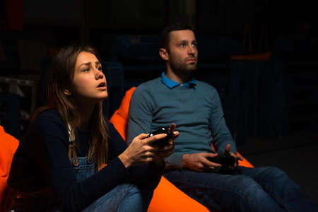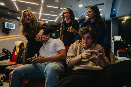 Gripped teens friends having fun playing a video game competition, stress emotion