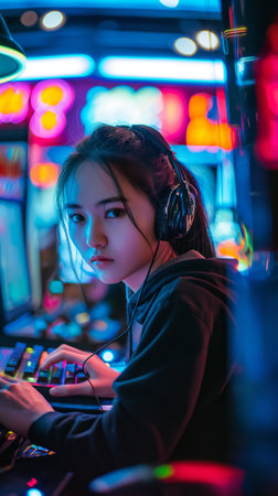 Soft focus, Professional cyber gamer play in video game championship in neon color blur background