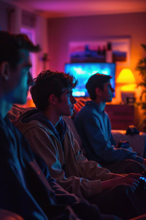 Three high concentrated young guys with joysticks play exciting video game at home in dark room. Tension to win tourney.
