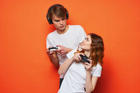 young couple in white t-shirts with joysticks in hands playing game friendship orange background