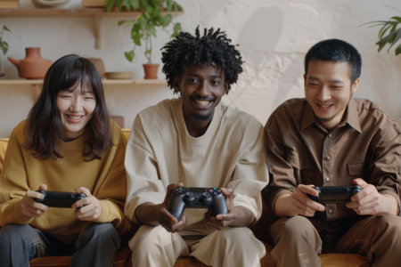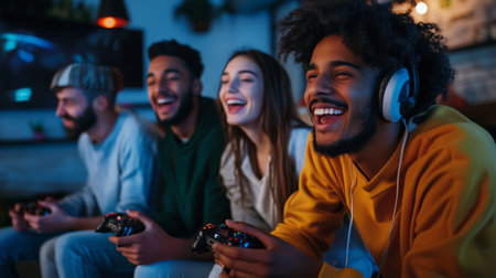 Happy friends playing console games enjoying free time team up tension free time activity friend competition colleagues break joystick sitting on couch sofa living room excited play people videogames