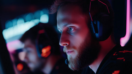 Professional gamer playing online games tournaments pc computer with headphones, Blurred red and blue background