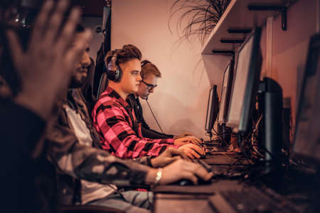 Group of guys in headphones sitting at the table in front of computers and playing computer games in computer club