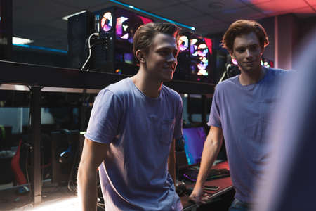 Male cyber sport gamers looking at somebody, while participating in e sport tournament