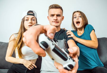 A friendly company of students plays games on the console and laughs. Friendship concept. World Friendship Day. Students' Day.
