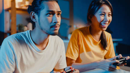 Happy asia young couple man and woman sit couch use joystick controller play video game spend fun time together in living room at night. Asian married couple family lifestyle, Stay at home concept.