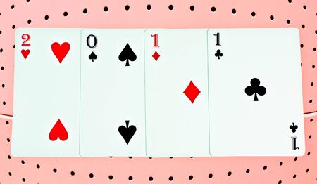 online gambling. Pc mouse, four aces, dice, darts on a pink-blue background. top view