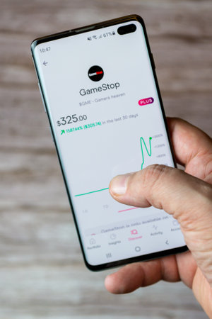 LONDON, UK - February 2021: Gamestop stock market price graph on a smart phone