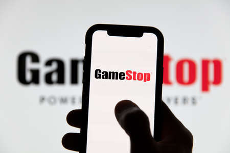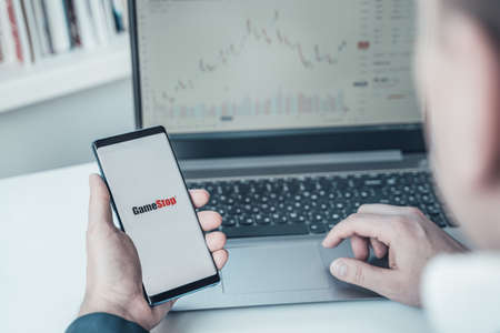 LONDON, UK - February 2021: Gamestop in front of stock market price graph