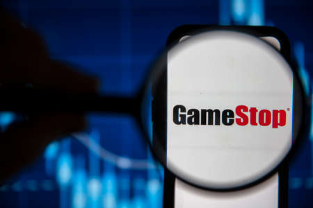 LONDON, UK - February 2021: Gamestop video game under magnifying glass