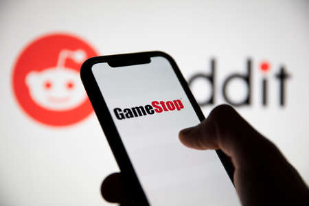 LONDON, UK - February 2021: Smartphone showing Gamestop by a reddit