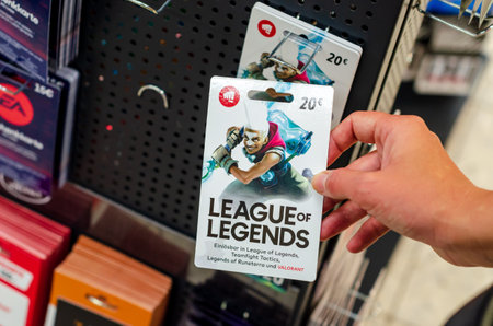 Soest, Germany - September 11, 2021: League of Legends gift card for sale in the shop.