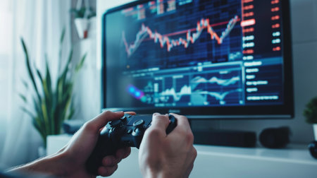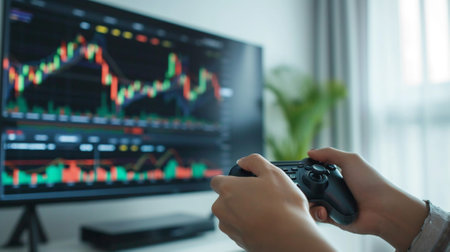 hand of the person pressing game joystick on stock chart screen, trading or investing like a game and investing is a part of life concept