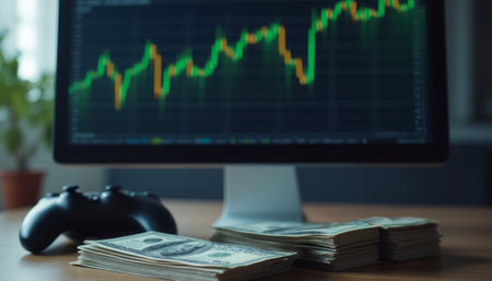 A financial setup featuring a computer screen displaying stock market graphs next to a stack of money, symbolizing investments and economic activity. The image highlights finance and trading.