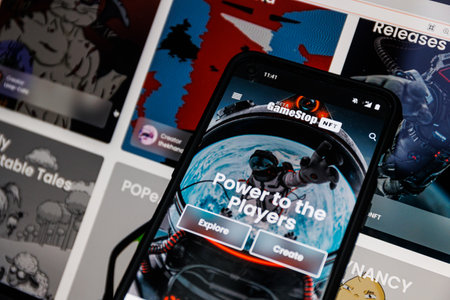 Houston, Texas - 2022, July 12: GameStop NFT marketplace on mobile phone and PC. GameStop launch brand new A non-fungible tokens marketplace