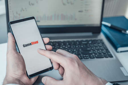 Russia Moscow 02.02.21 Mobile phone with logo of Gamestop in hand. Company making video games. Playing on trading exchange,price,market manipulation. Scandal with Reddit, Robinhood. Losses, crisis.