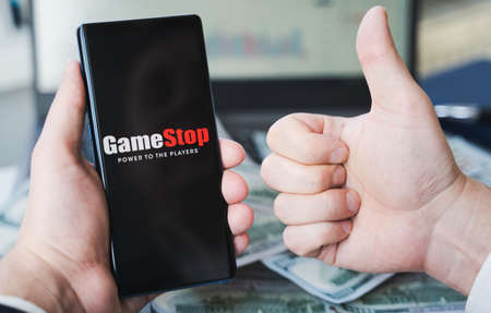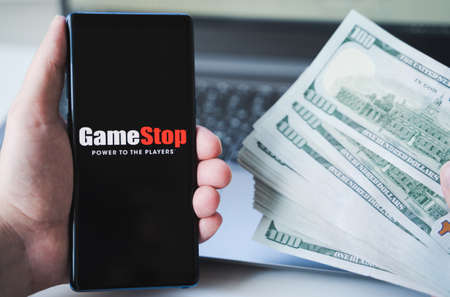 Russia Moscow 02.02.21 Mobile phone with logo of Gamestop, money, dollars in hand. Company making video games. Trading exchange,price,market manipulation.Scandal with Reddit,Robinhood. Losses, crisis.