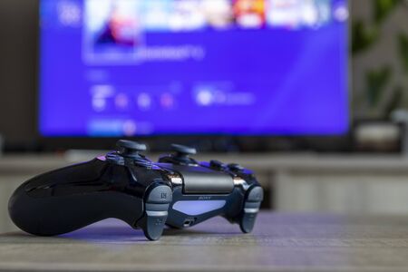 Russia, OKTOBER 24 2019: The new Sony Dualshock 4 with PlayStation 4. Sony PlayStation 4 game console of the eighth generation.