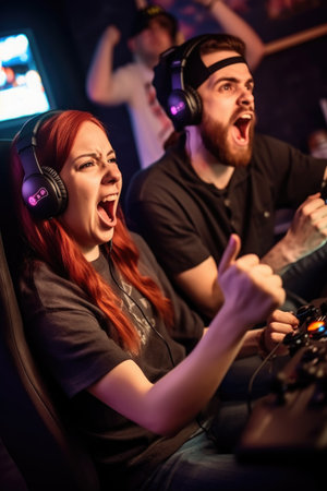 shot of a young woman cheering while her male friend plays video games in a competitive tournament, created with generative ai