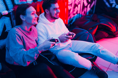 Young man and woman couple plays on game console with gamepad sitting on chair.
