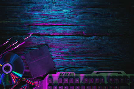 Laptop with gamepads, cd discs on a wooden floor. Blue red neon light. Gradient glow. Gaming still life. Top view