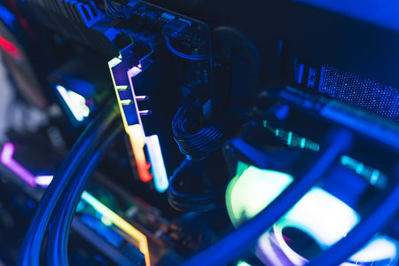 Inside of professional gaming computer with glowing parts in rainbow colors. Dark blue lighting. High quality photo