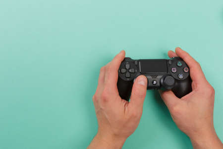 Entertainment, home electronics, gaming concept: a teenager hands holding wireless controller gamepad playing console video game