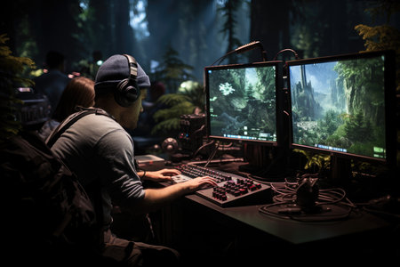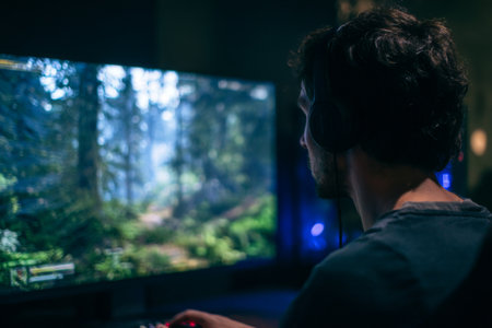 A person wearing focuses intently on a gaming monitor headphones displaying a lush forest landscape. The setting is dimly lit, enhancing the colorful graphics.