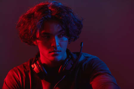 Professional gamer playing online games tournaments pc computer with headphones, Blurred red and blue background