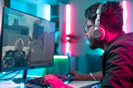 gamer with wireless headset playing online video game on computer pc at home - concept of concentration, online video gaming and competition.