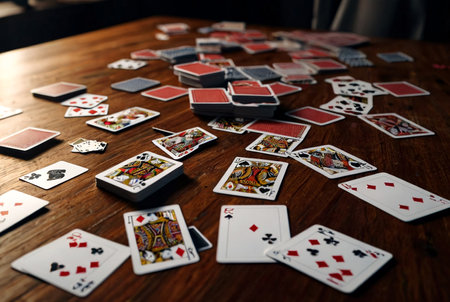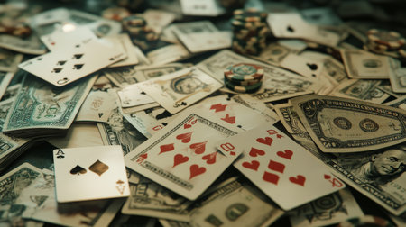 Poker table with playing cards and cash scattered across the surface