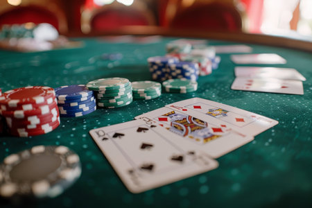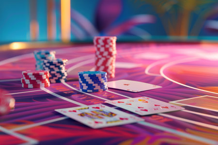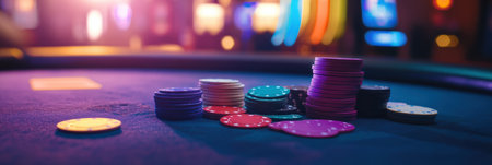 Stacks of vibrant poker chips are arranged on a casino table, surrounded by playing cards, creating an atmosphere of excitement.