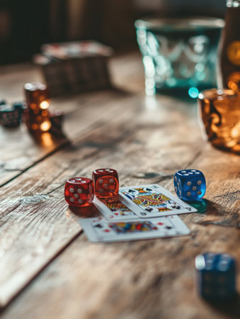 A lively game night features colorful dice and playing cards scattered across a rustic wooden table, illuminating the cozy ambiance.