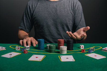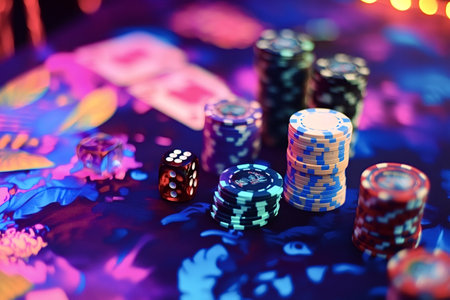 Stacks of colorful poker chips and red dice are lying on a vibrant, patterned casino table, creating a scene suggestive of gambling, risk, and the potential for addiction
