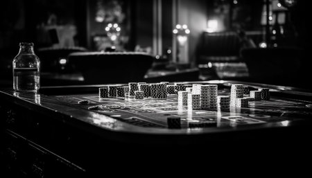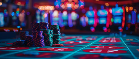 A close-up captures a casino roulette table, highlighted by stacked chips. The scene features a shallow depth of field, emphasizing the table's detail. Bokeh lights create a soft background, adding atmosphere to the image. This photograph is suitable for various commercial purposes, including marketing and editorial use.