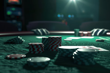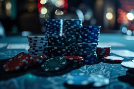 Poker chips in various colors are stacked on a casino table, inviting players to engage in the thrilling card game under bright lights.
