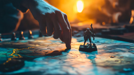 Hand moving a fantasy miniature figure across a vibrant board game, enhanced by warm backlighting, immersing players in an engaging tabletop gaming experience filled with adventure