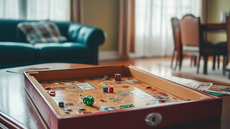 A vibrant image capturing a classic board game with dice and pieces on a wooden table in a cozy living room, evoking feelings of nostalgia, relaxation, and social interaction.