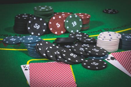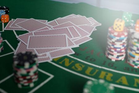 Gambling chips and cards on a green cloth Casino table