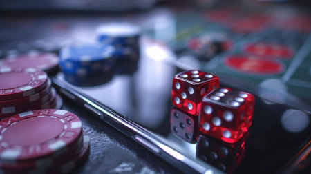 Exciting online casino gaming scene where a phone displays digital games alongside vibrant betting chips and dice