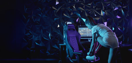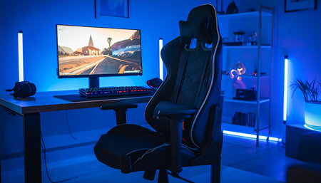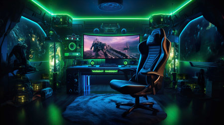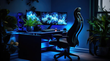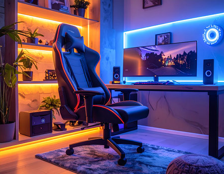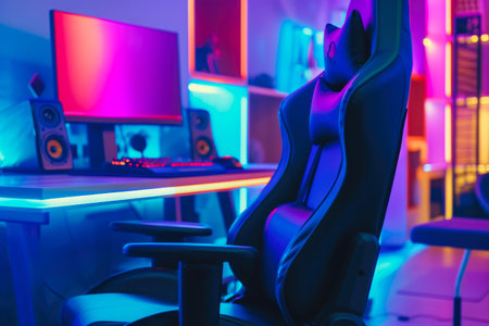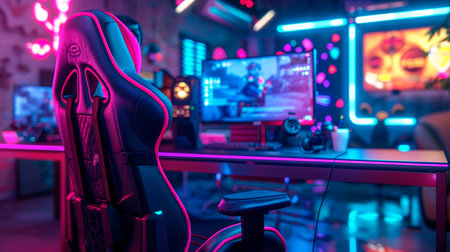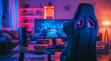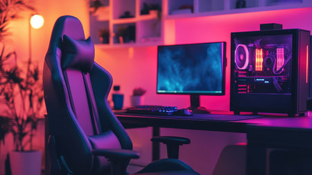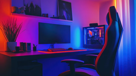 This interior showcases a gaming room equipped with a computer setup and vibrant neon lighting. The scene highlights a workstation featuring a monitor, peripherals, and a comfortable chair. The composition displays a modern design, with a focus on lighting effects and a tech-focused theme, suitable for editorial and commercial applications.