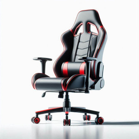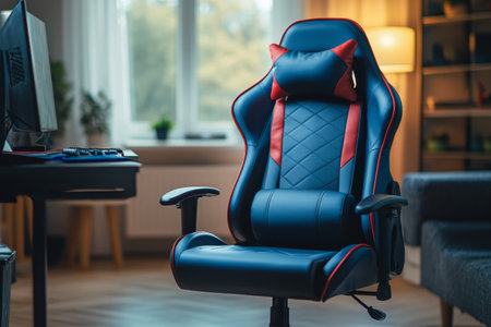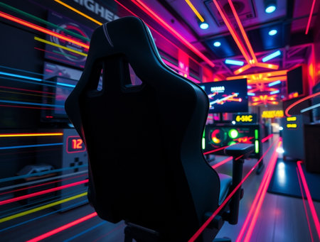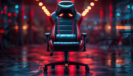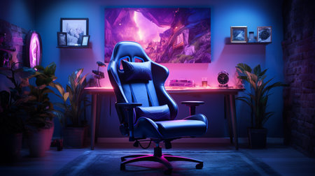 the gaming chair sits proudly in the room, surrounded by a sleek and modern decor, with a vast empty wall space above it, waiting to be filled with vibrant posters, shelves, or a stunning led light installation to elevate the overall gaming experience and ambiance. ai generated