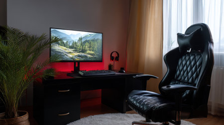 Modern gaming room featuring a sleek computer set up on a desk accompanied by an ergonomic chair for maximum comfort. Generative AI