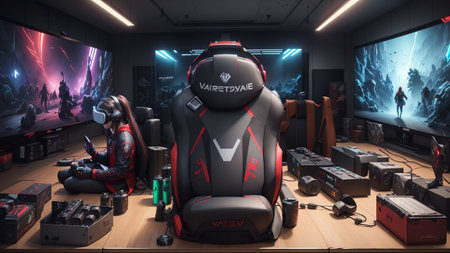 virtual reality headset on a gaming chair with led lights, created with generative ai