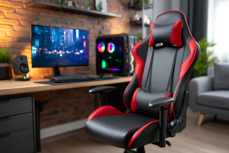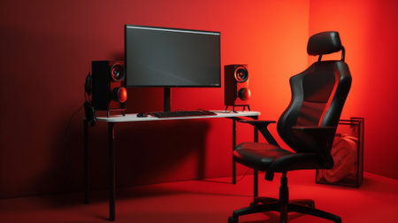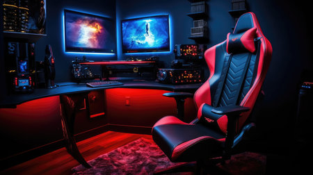Gaming chair in game room. Professional gamers room with powerful personal computer game chair black and red color. Concept cyber sports arena. Online gaming modern technology entertainment and streaming video concept