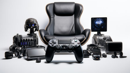 Futuristic gamer workspace. Computer mouse chair, gamepad, joystick, headphones, video game controller. Vector illustration