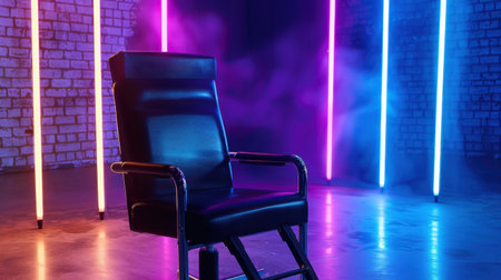 A contemporary chair is highlighted by striking neon lights in a stylish studio space. The vibrant colors and atmospheric smoke create an intriguing visual setting.