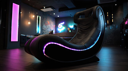 A stylish, black gaming chair takes center stage in a dimly lit room. The chair features integrated LED lighting, creating a vibrant visual effect. The scene uses contrasting colors and textures, suggesting a contemporary indoor setting. Suitable for various applications, including editorial content and promotional materials.