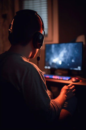 back view of a man playing video games on his laptop, created with generative ai